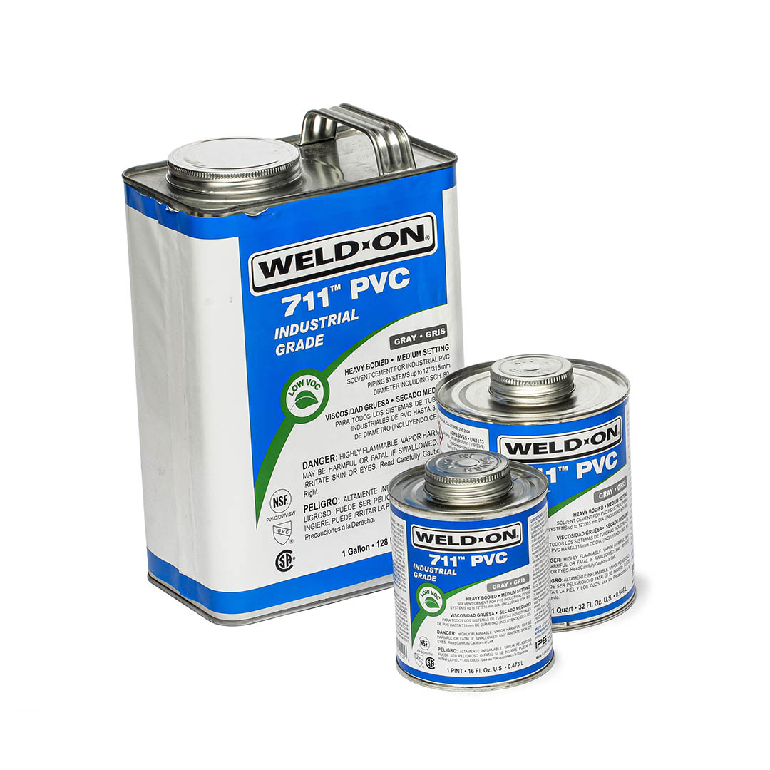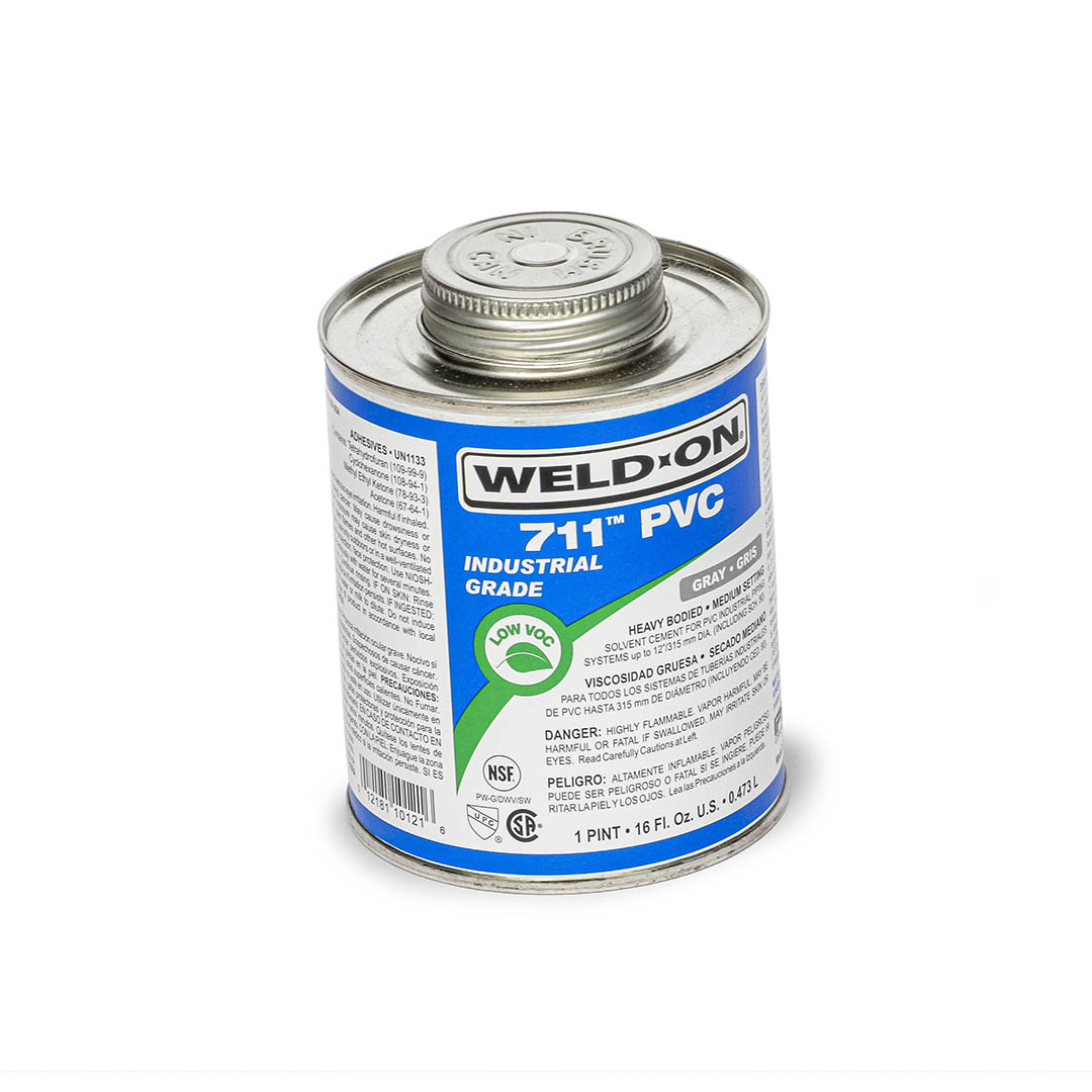 Soldadura PVC 711 Weld On Cemento para PVC de viscosidad alta, endurecimiento medio y VOC bajo para toda clase de tuberías y cédulas (sch.) con ajuste de interferencia. Su buena capacidad de relleno y su tiempo de endurecimiento medio permite trabajar por más tiempo en climas cálidos. La fórmula de gran resistencia es ideal para sistemas de tuberías industriales.